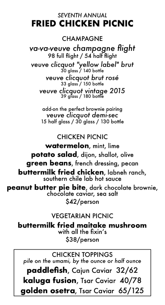 Our famous Effervescence Fried Chicken & Champagne Picnic makes its annual return! Pair it with a special Veuve Clicquot flight, on the menu all weekend.